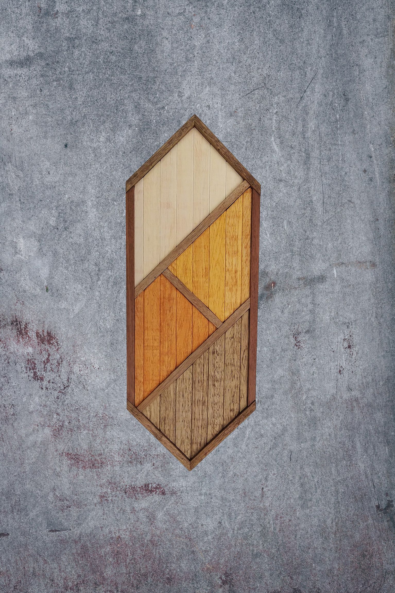 É uma arteproduzida em madeira com formas geométricas. Sendo cada peça única, feita à mão e esculpida usando uma variedade de madeira